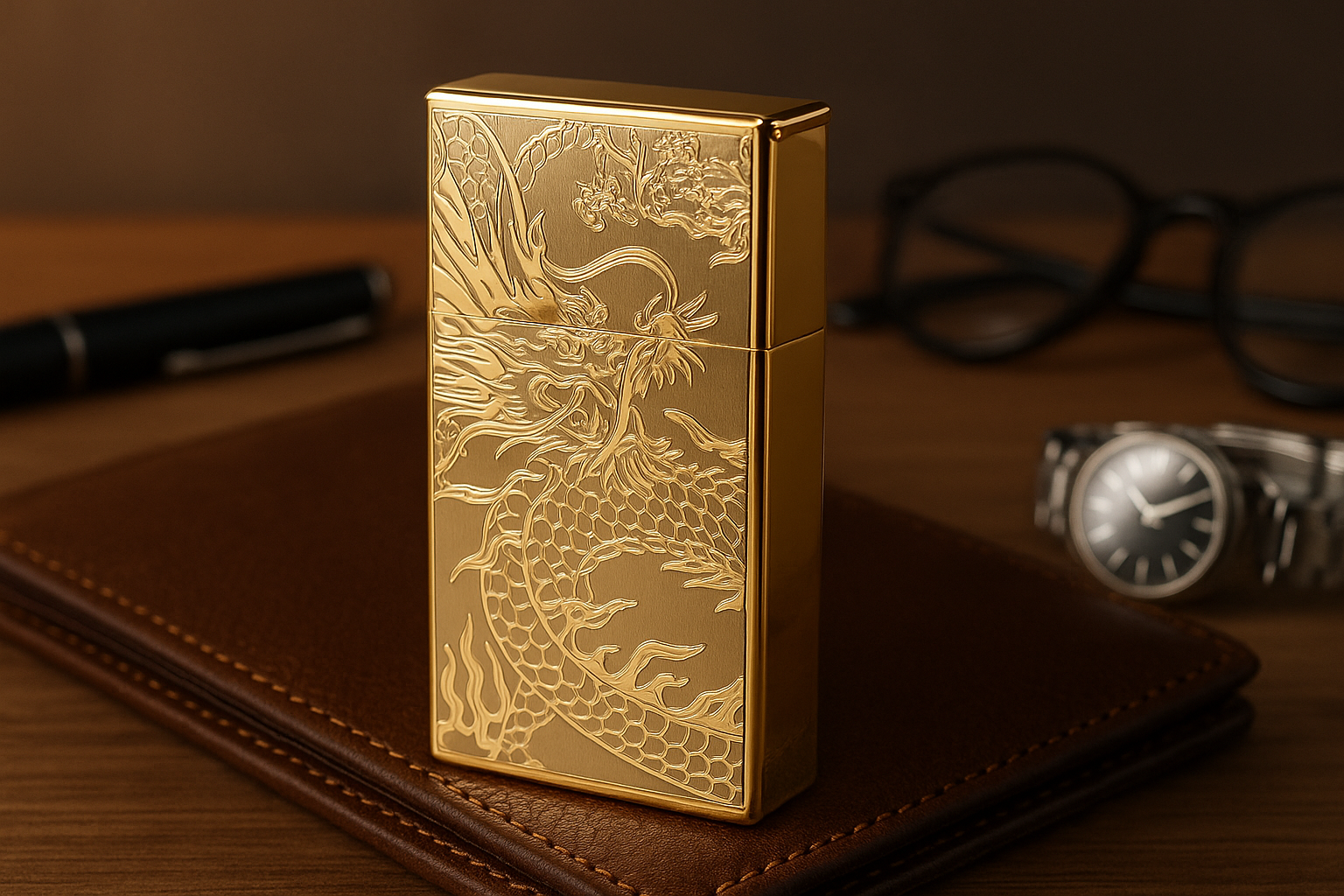 Altın tonlu kabartmalı ejderha motifiyle bezelidir;